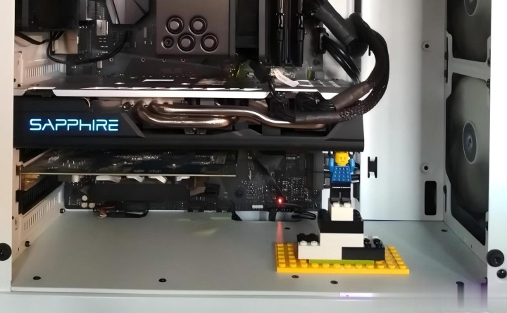 除此之外,网友们也纷纷分享奇特的防显卡下垂图片,比如使用乐高积木,还特别制作成有人撑起的模样: